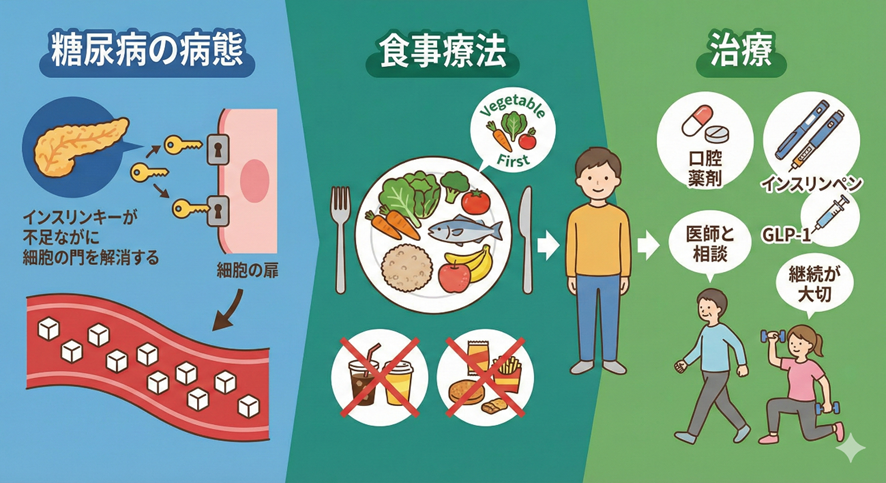 治療の目的は、血糖値をコントロールしてこれらの合併症を防ぎ、健康な人と同じように元気に生活することです。